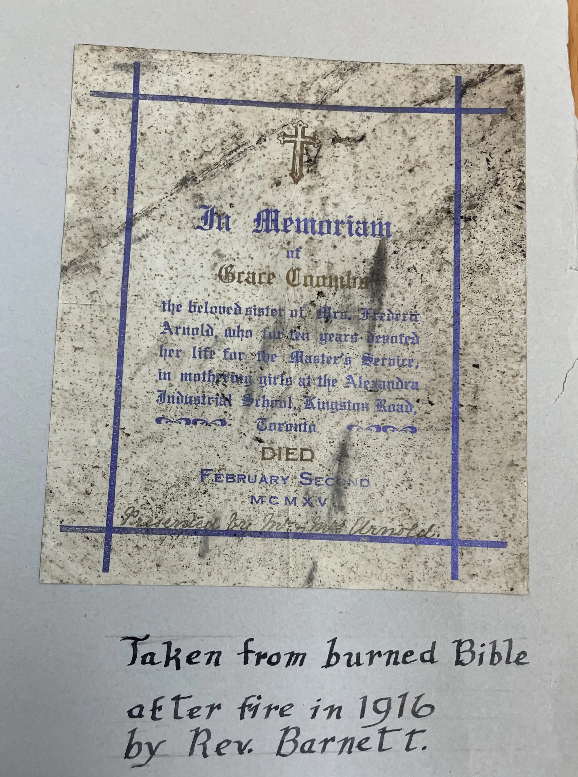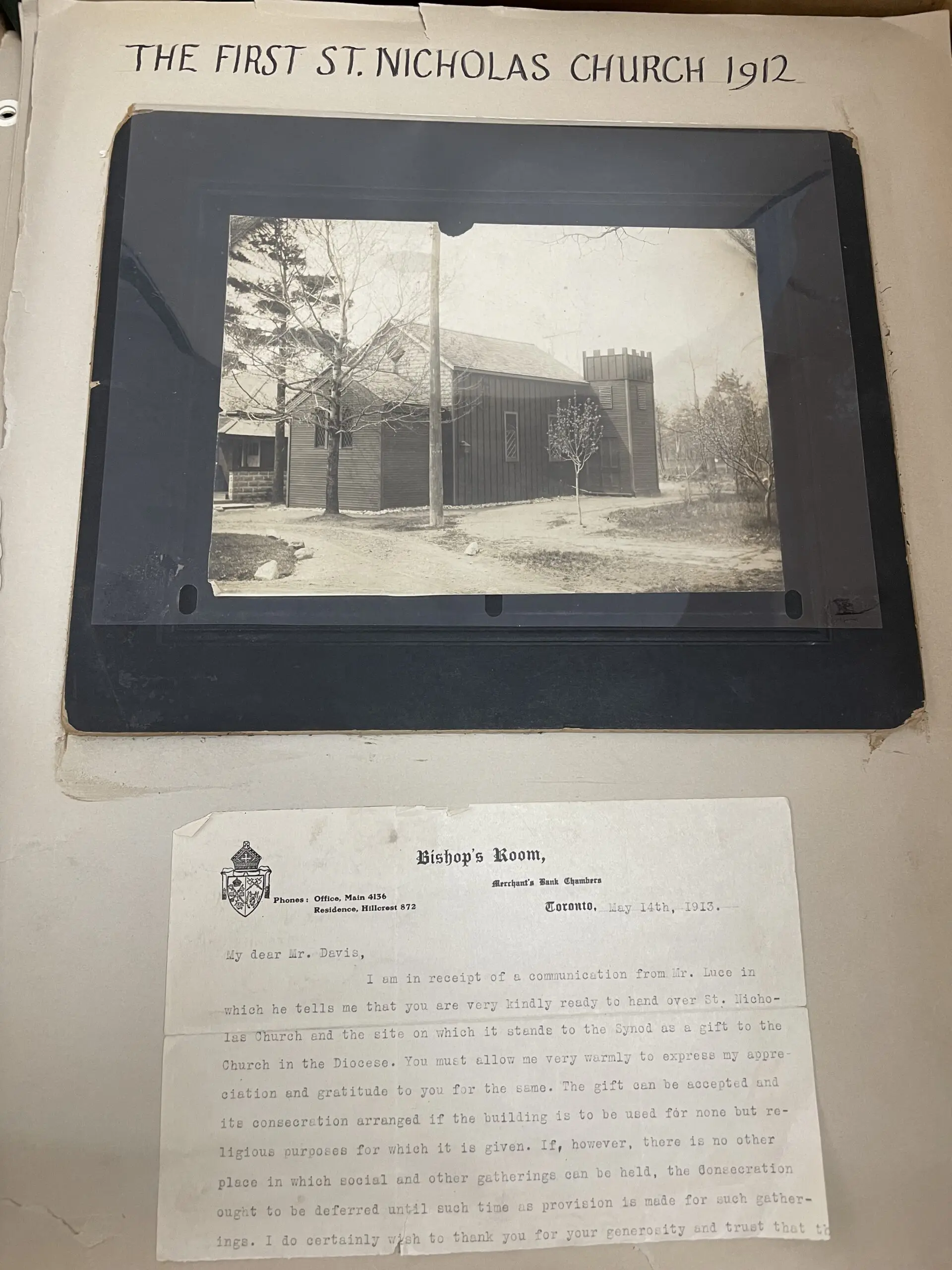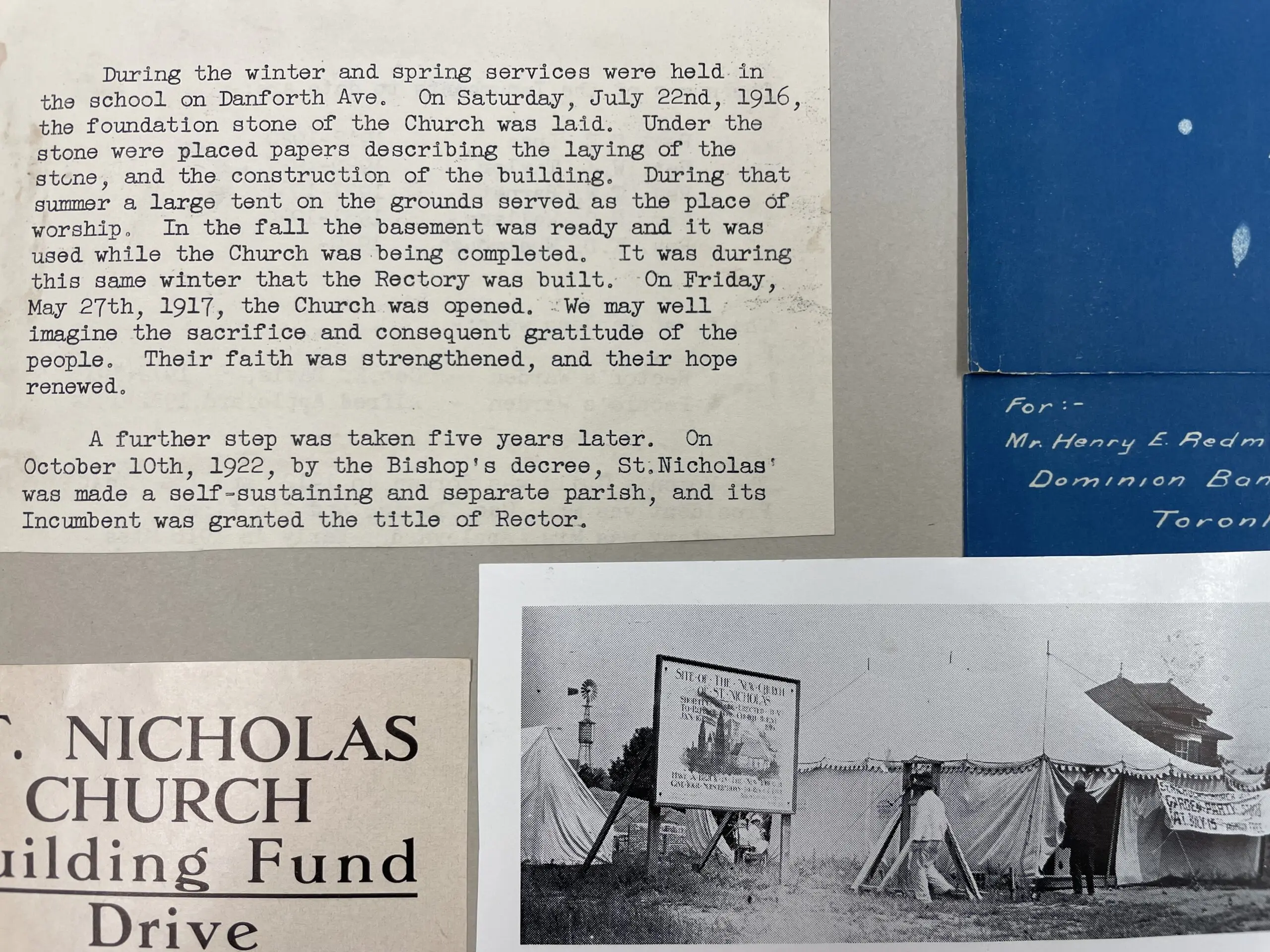 Scrapbooks can be a fun way of documenting the history of a parish and may include pamphlets, newspaper clippings, photographs and even sometime items made of fabric, such as ribbons. Some scrapbooks are primarily newspaper clippings, which, due to the acidic nature of newspaper, tends to be difficult to preserve well. These types of scrapbooks are also often missing contextual information, such as written explanations, to help understand the overall purpose of the scrapbook. Were they just newspaper articles the person found interesting, or did the newspaper articles have some sort of common theme to the person compiling the scrapbook? However, the Archives holds a lovely example of a scrapbook from St. Nicholas, Birch Cliff. This scrapbook documents the history of St. Nicholas from 1912 until 1987, and the first pages include a memorial book plate from a bible salvaged from the 1916 fire, an image of the tent used for services before the building was rebuilt and a copy of the original 1923 building fund poster. Someone has taken the time to identify the items that are attached to the pages, making it easy to maintain order even though the pages have been removed from the cover to allow for better storage.