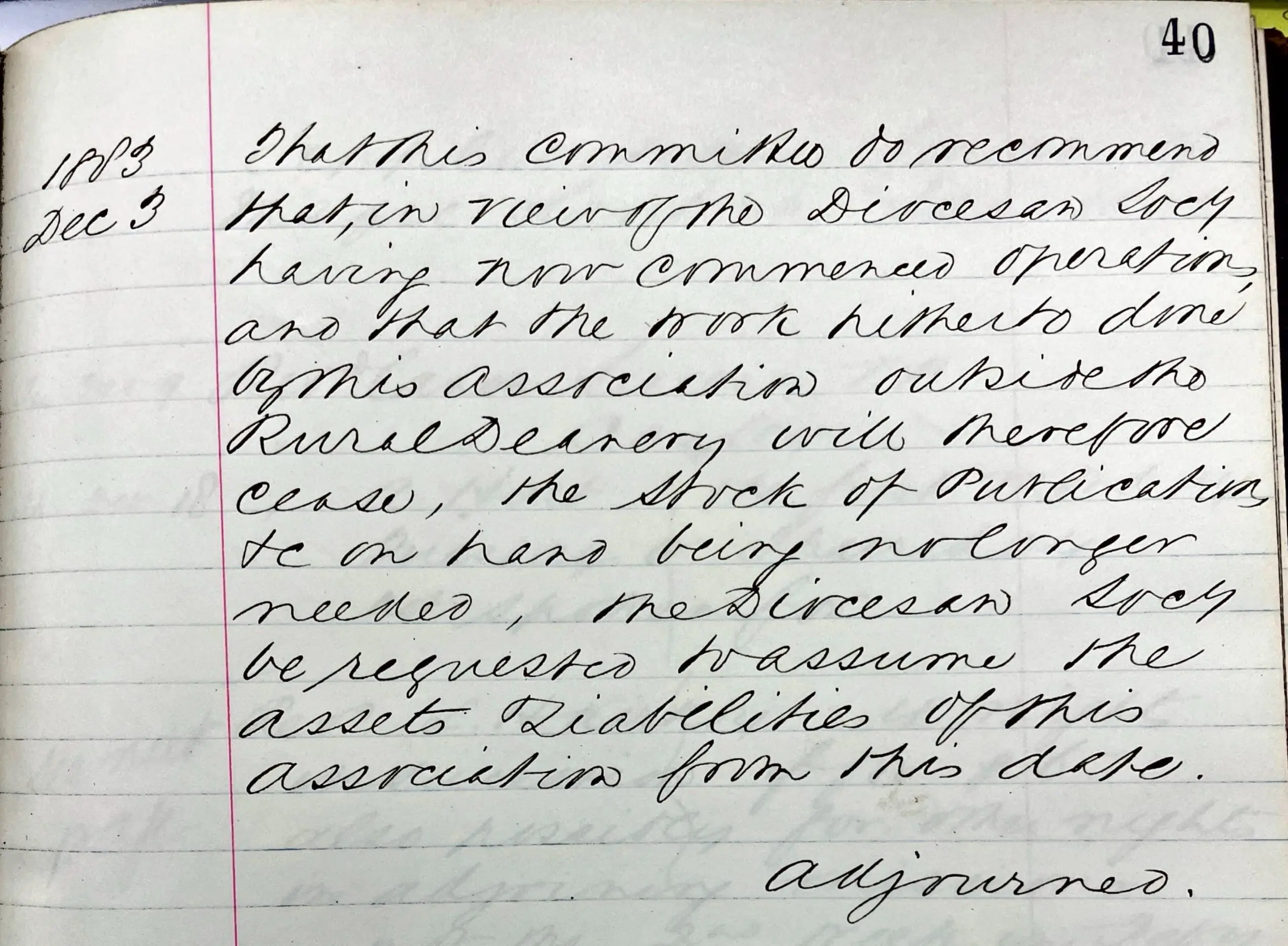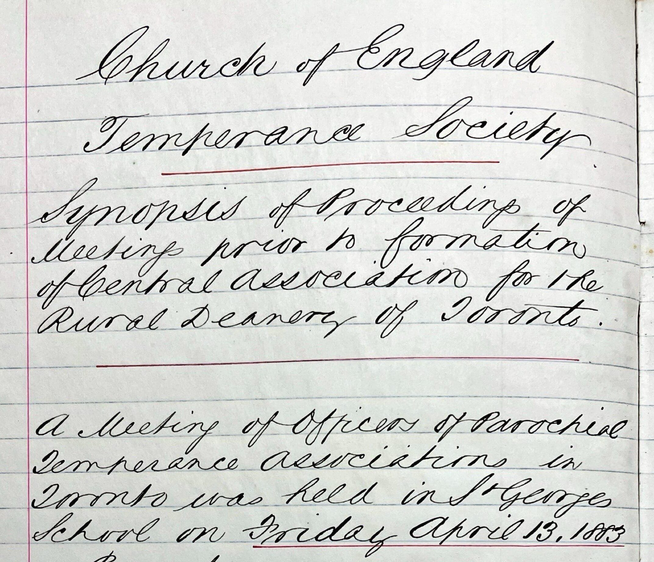 On April 13, 1883, a group of clergy from parishes within the City of Toronto met to form a Temperance Society central association for the Rural Deanery of Toronto with the “view of unity of action as to their work, and of adopting measures for increasing the number as well.” At the June 1883 Synod meeting, the bishop’s charge mentioned the good works of the Temperance Society central association for the Rural Deanery of Toronto and encouraged that “the present session of Synod must not be allowed to close without . . . forming an energetic and capable Diocesan association of the . . . Temperance Society.” In November 1883 a Diocesan Temperance Society was established, and the Temperance Society Central Association held its final meeting on Dec. 3, 1883. The Archives holds the 1883 minute book for the Temperance Society Central Association for the rural deanery of Toronto, as well as the 1883-1894 minute book for the Temperance Society of the Diocese of Toronto. Another year we may have to touch on Rural Deaneries as the precursor to Regional Deaneries, as it’s quite amusing to think of Toronto as being a rural deanery.