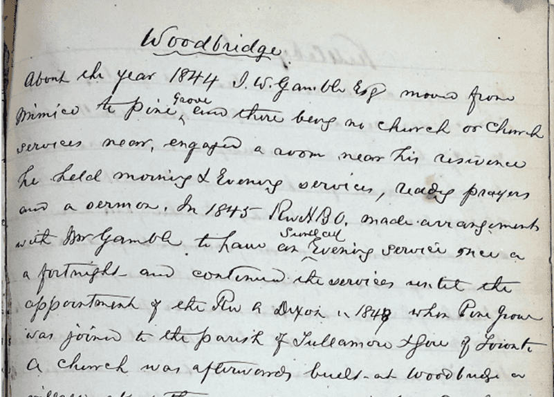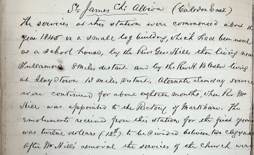 The Rev. Canon Henry Bath Osler was a travelling missionary in the Bolton and Lloydtown areas from 1843-1874. In 1874 he became the rector of St. John, York Mills and established the Eglinton Mission, which became St. Clement, Eglinton in 1891. He retired from St. John, York Mills in 1900. On deposit with the Archives is a record book he kept that includes early meetings regarding the establishment of an Eglinton Mission from 1888-1892, annual return information and communicants for St. John, York Mills and the Eglinton Mission from 1891-1895. However, it also includes his written histories of the various missions that he ministered to in the Bolton and Lloydtown areas from 1843-1874. These include Bolton, Lloydtown, Nobleton, Albion, Bolton Mills, Woodbridge, Kettleby, Roley’s Station (Palgrave) and Sandhill.