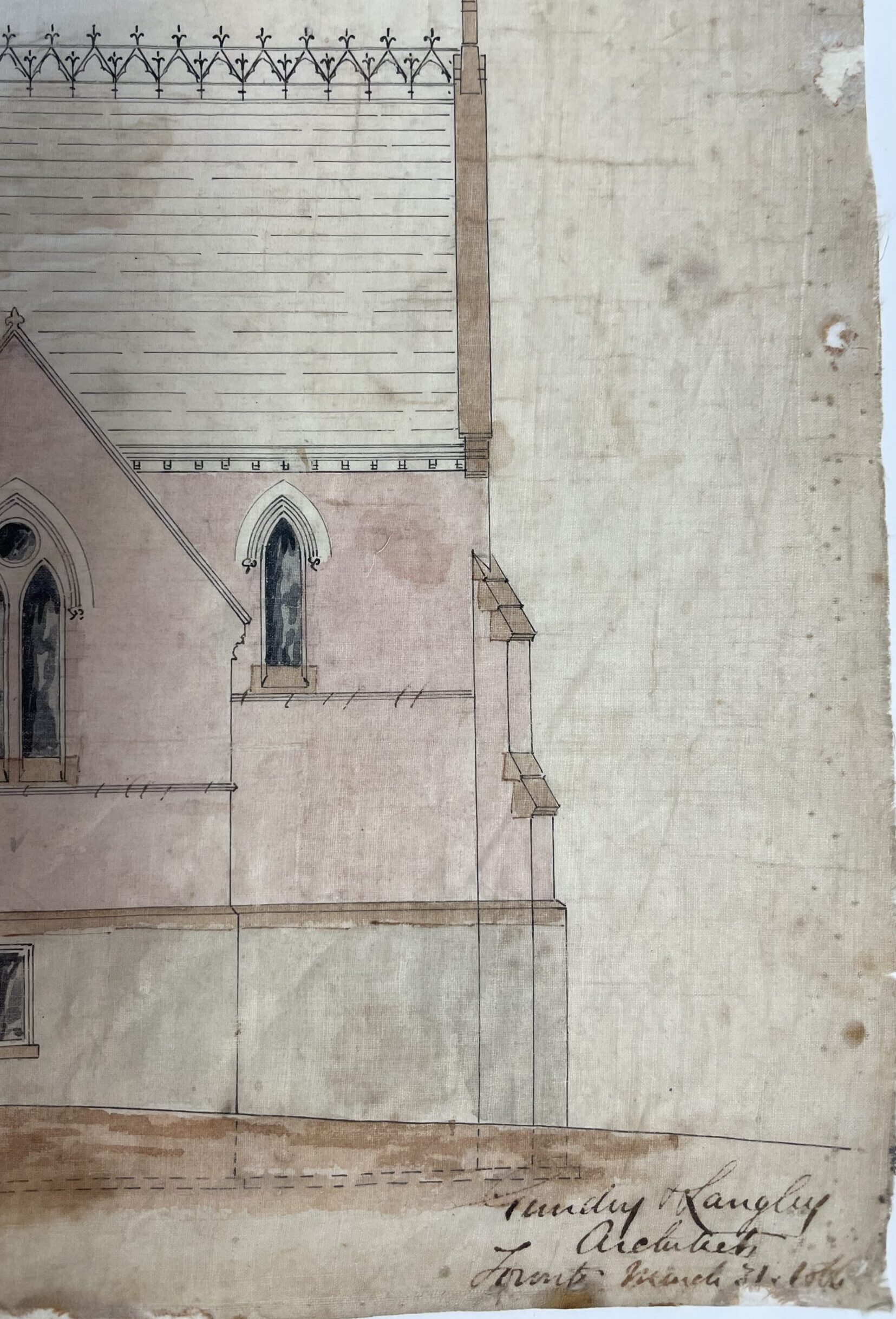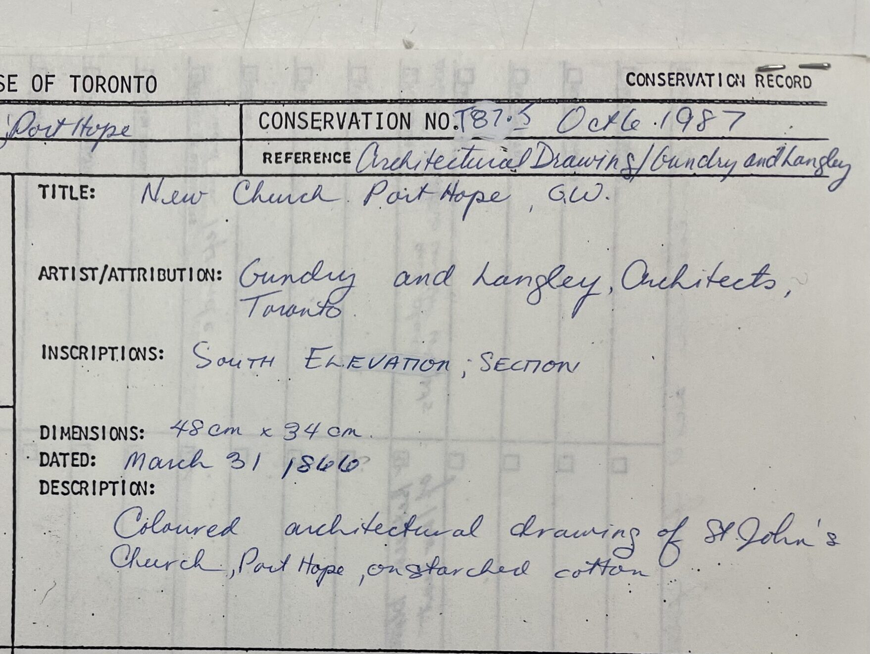 Early architectural plans and drawings, which were hand drawn rather than using computer programs, can also be works of art. The Archives holds only a few architectural plans that were created prior to the 1950s. One of these sets of architectural drawings are the 1866 drawings for St. John, Port Hope by Gundry & Langley, which they have coloured. As determined by conservation work completed in 1987, these drawings have been done on a starched cotton fabric called drafting linen rather than on wood-pulp or rag paper.