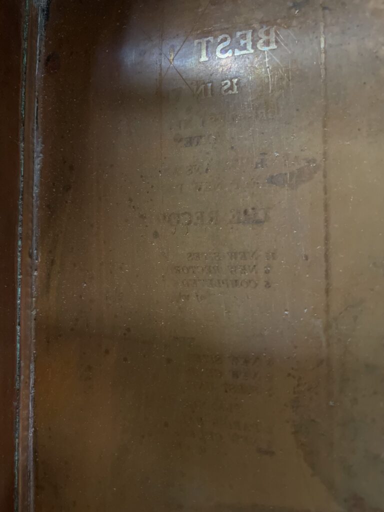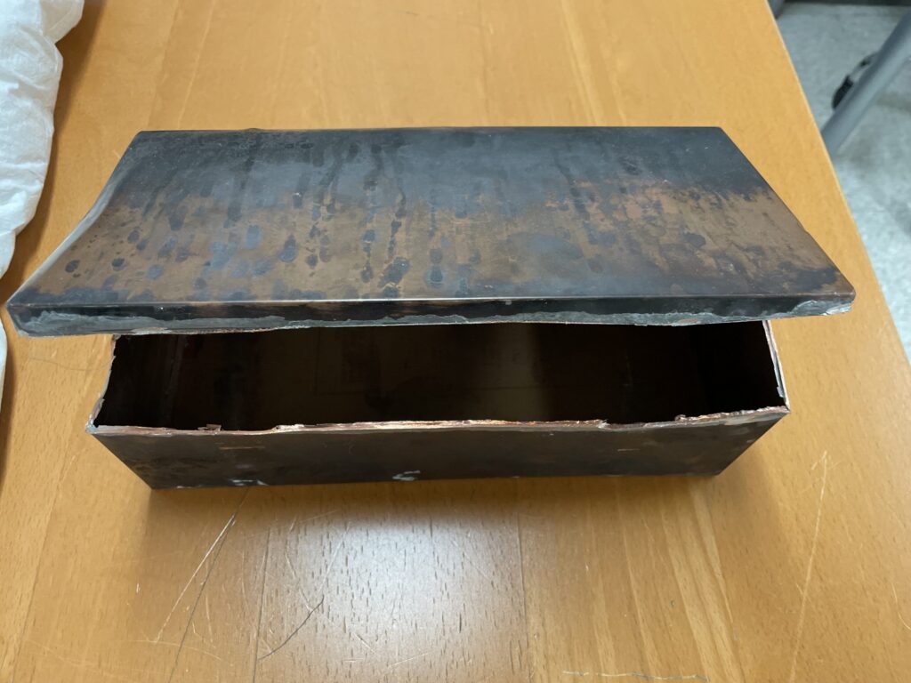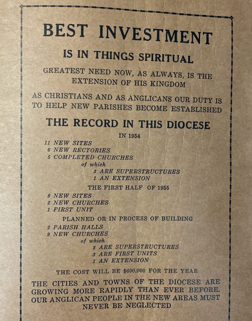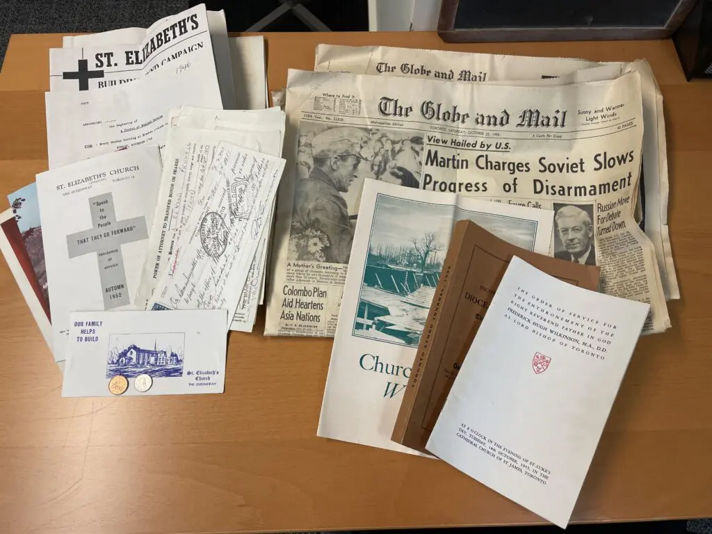 The contents of the time capsule included service bulletins from the turning of the sod ceremony and the laying of the cornerstone, a building fund canvas booklet and pledges, two coins minted in 1955, the Globe & Mail from Oct. 22, 1955, along with a 1955 Synod Journal and the order of service for the enthronement of Bishop Wilkinson on Oct. 18, 1955. It’s hard to believe that all of that was able to fit into such a small box; however, the imprint of the back on the Synod Journal onto the copper inside the box confirms that they were!