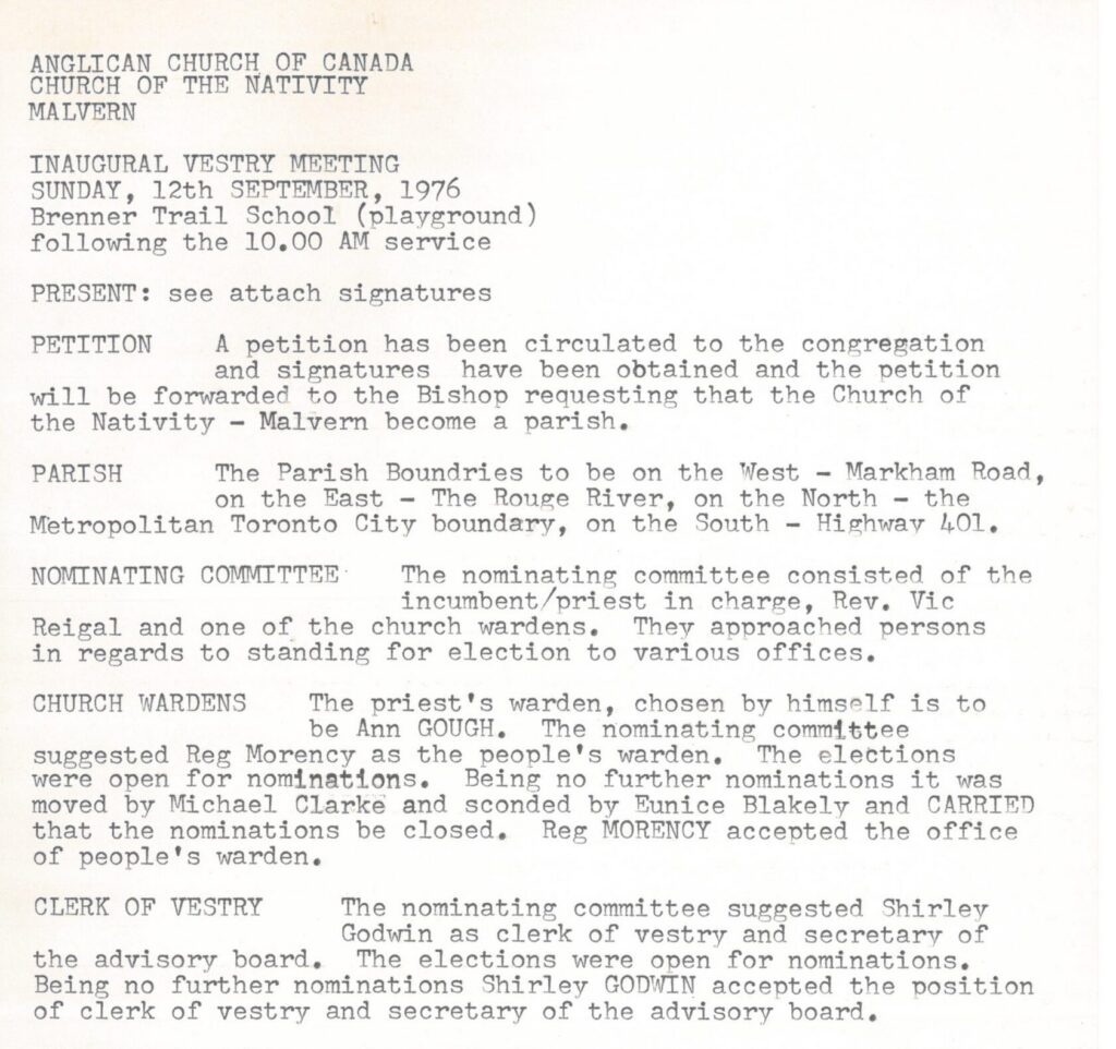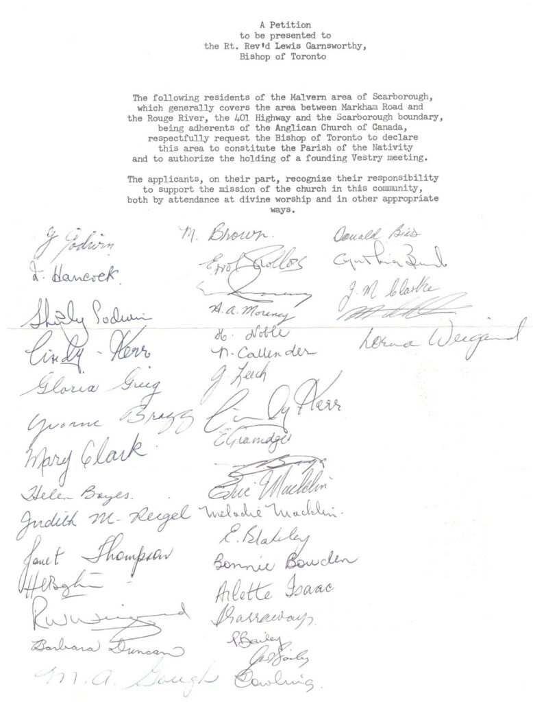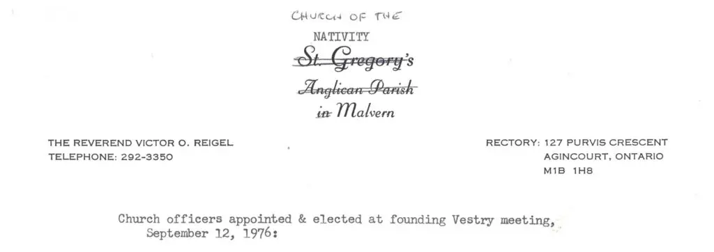 In June 1976, the Church of the Nativity located in the neighbourhood of Monarch Park voted to disestablish. It offered its memorials and some financial assets to the congregation in Malvern, and the decision was made to take the name Nativity rather than keep the name St. Gregory. At its inaugural vestry on Sept. 12, 1976, the congregation of Nativity, Malvern circulated a petition for signatures that would be sent to the bishop to set them apart as the parish of Nativity, Malvern.
