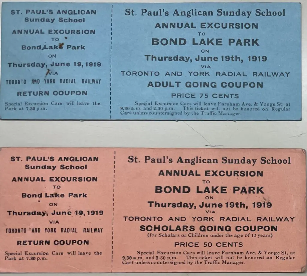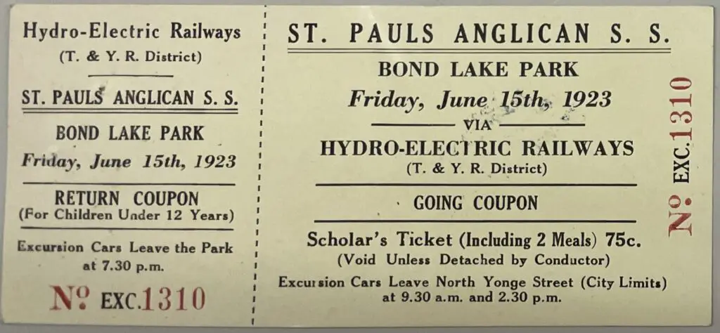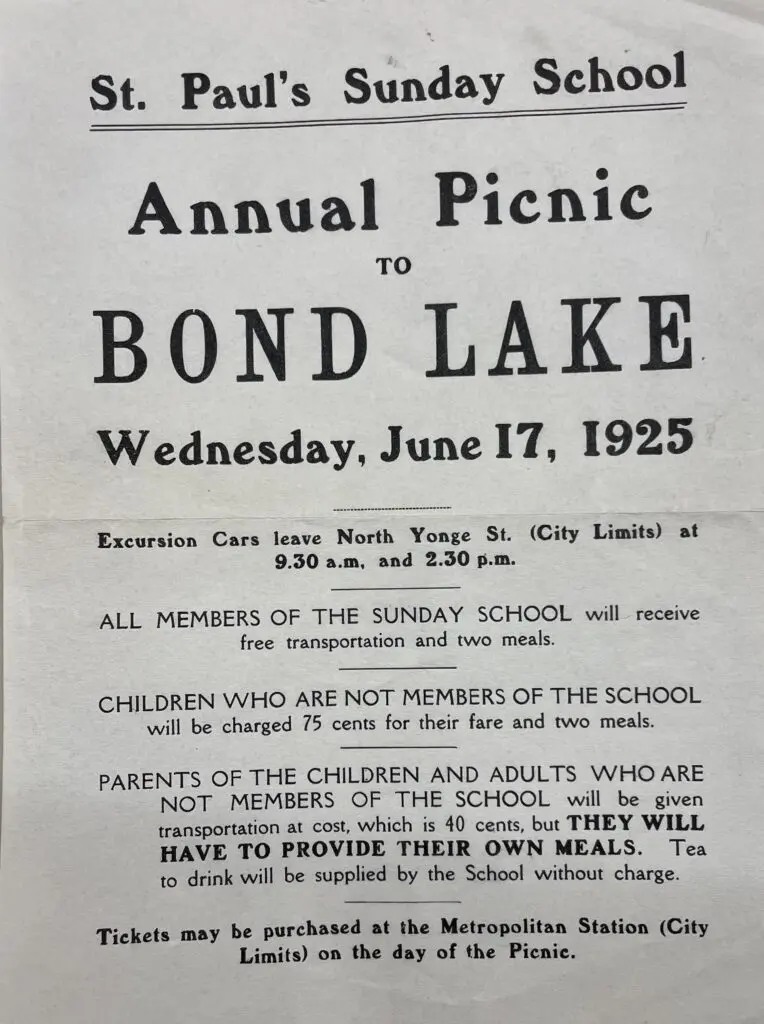 The records of the Sunday School picnics held by St. Paul, Bloor Street between 1919 and 1925 provide information about the picnic logistics, as well as the changes in transit during that time period.