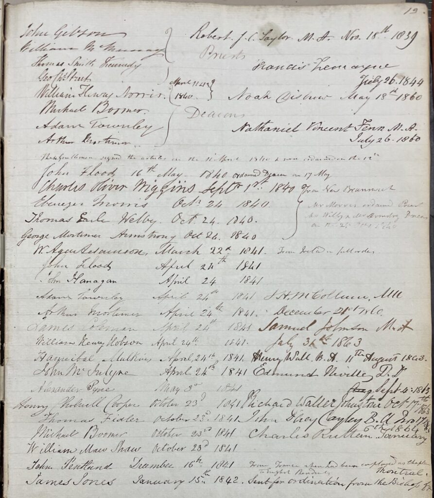When a person is ordained a deacon and then again when they are ordained a priest, they must make oaths and subscriptions in the form of certain declarations. On Aug. 4, 1839, the Rev. John Strachan became bishop of the newly set apart Diocese of Toronto. Three months later he ordained the first priest in the Diocese of Toronto, the Rev. Robert J.C. Taylor. Mr. Taylor became the first person to sign the register of oaths and subscriptions, though his signature is only appended to the Articles of Religion at the beginning of the register.