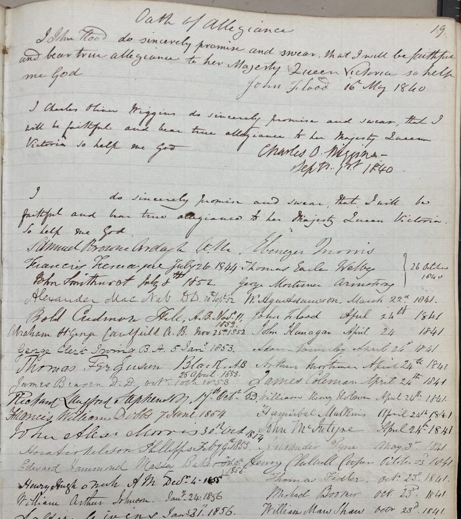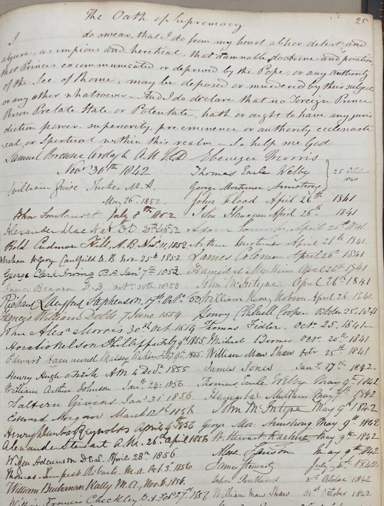 Those ordained in 1840 and onwards have signed not only the Articles of Religion but also the Oath of Allegiance to Queen Victoria, the Oath of Supremacy, the Oath against Simoniacal Contracts, the Oath of Canonical Obedience, the Oath of Residence and the Declaration.