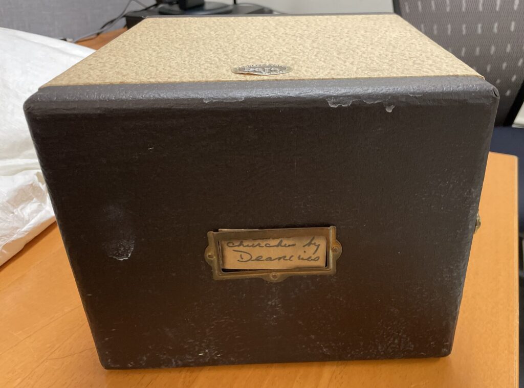 The Diocesan Archives holds a fairly large collection of slides. Recently we had a volunteer help with rehousing these slides into archival-safe containers. One of the more interesting collections of slides resulted from the first project that Bishop Wilkinson asked the newly formed Archives Committee to undertake in 1956. He asked the committee to take slides of all church-related building exteriors in the Diocese, as well as slides of the interiors of churches. These were stored in a unique wood and leather box, with drawers of slides sorted by deanery. The original storage box has been kept for its unique qualities, and the slides have been rehoused to acid-free slide boxes.