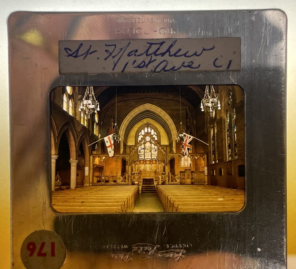 A future archives project will involve digitizing these slides. Once digitized, we hope that some congregations might be interested in taking the photos from the same angles today to be able to compare how surroundings and church decorations have changed in 70 years.