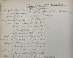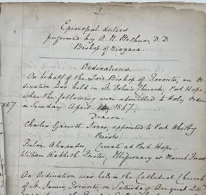 Among the responsibilities of the bishop is the duty to perform Episcopal Acts, including such things as consecrations, ordinations, appointments, confirmations and laying of cornerstones. We have records of such Episcopal Acts beginning with Bishop Bethune’s register of these events, which begins in 1867 after he was elected coadjutor bishop of Toronto in 1866 and the Bishop of Niagara in 1867.