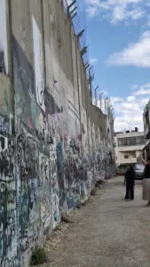 The brutality of the artwork we saw at the university and the staggering destruction of the Palestinian environment (multiplied in Gaza by the equivalent of 11 times the bombing destruction of Hiroshima) was enough for one day. But then we encountered the wall blocking Bethlehem from Jerusalem: part of an 810-km structure that runs between Palestinian towns across the West Bank, cutting each community off with armed checkpoints and random road access closings. Where we were standing, it was three storeys of ugly cement, capped by razor wire and covered in graffiti – some very clever, all of it expressing the rage over the unnecessary disruption of people’s lives. It makes getting to work or medical appointments challenging and at times even impossible; and because of the military permits required to visit other towns, families are also cut off from each other.